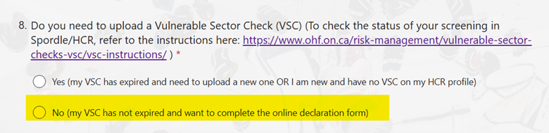 - Look up your VSC status in HCR/Spordle profile by looking under Background Checks on your profile. If your VSC has not expired or expiring in current season please go to Step 3.